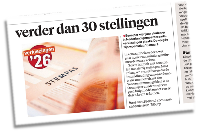 Daar waren ze weer: de Stemwijzers, voor iedere gemeente één. Een goede bijdrage van de krant aan onze lokale democratie. Uit de vragen en antwoorden die deelnemende partijen gaven, valt op te maken wat hun plannen zijn. Maar dat is niet zaligmakend.